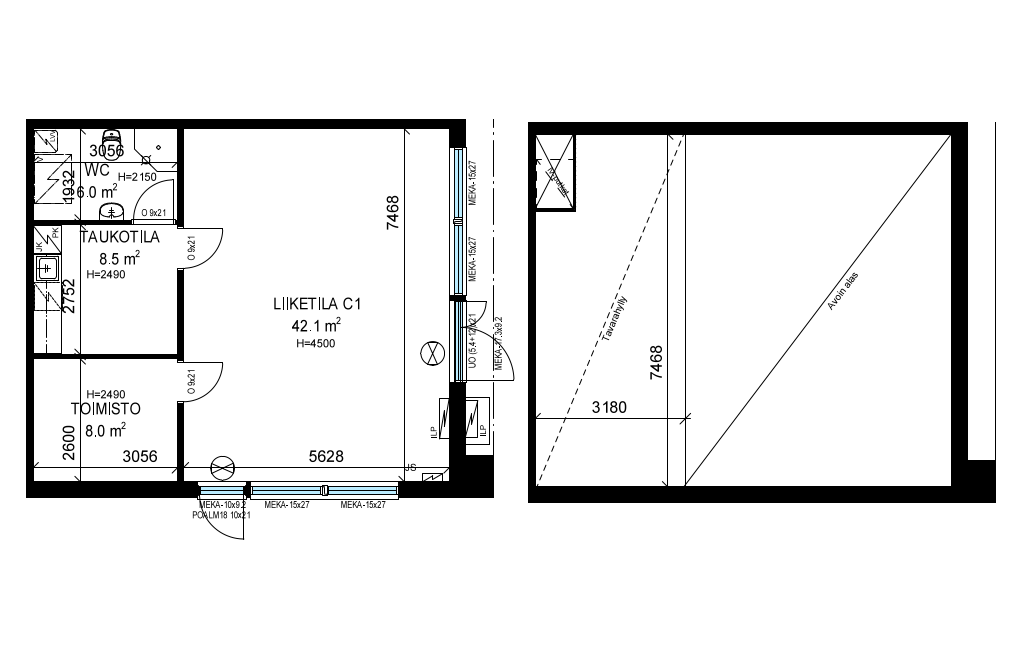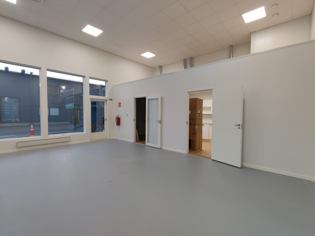 Liiketilan yhteydessä on oma toimisto (8,0 m²), taukotila (8,5 m²) sekä WC (6,0 m²), mikä tekee kokonaisuudesta toimivan myös kokopäiväiseen työskentelyyn. Selkeä pohjaratkaisu mahdollistaa tilojen tehokkaan käytön ja sujuvan arjen yritystoiminnassa.