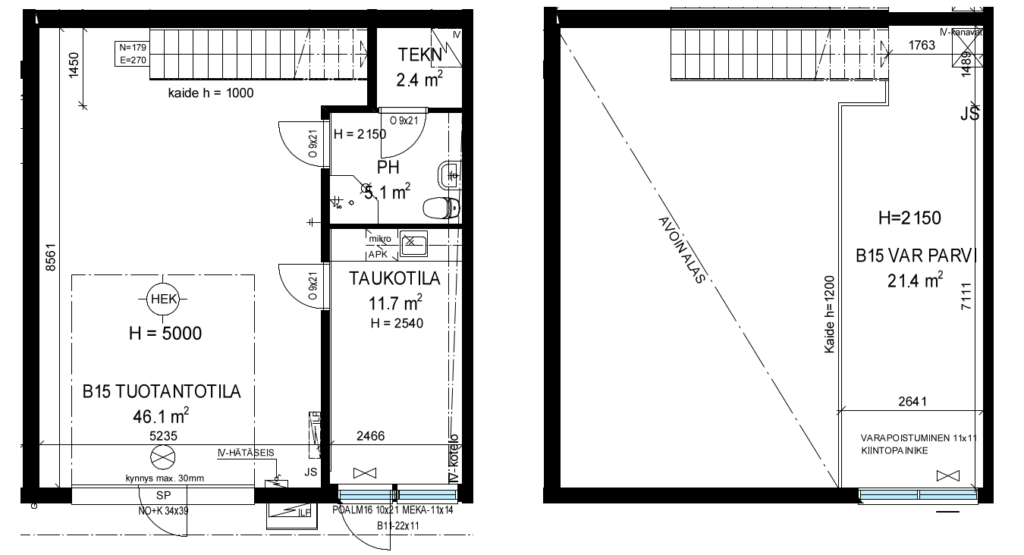 Tämä Talliosake-tuotantotila on suunniteltu vaativaan ja kokopäiväiseen käyttöön, ja se soveltuu erinomaisesti niin yritystoimintaan kuin aktiiviselle harrastajalle. Alakerran 65 m² tuotantotila tarjoaa vaikuttavan 5 metrin tilakorkeuden, joka mahdollistaa tehokkaan työskentelyn myös tilaa vaativien koneiden ja laitteiden kanssa.