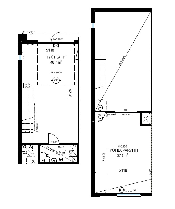 Alakerran 46,7 m² työtila muodostaa toimivan ja avaran kokonaisuuden, jota täydentää yläkerran 37,5 m² parvi. Parvi soveltuu esimerkiksi toimistoksi, työskentelytilaksi tai varastokäyttöön. Parven korkeus on 2,15 m, ja kulku on toteutettu tukevilla sisäportailla.