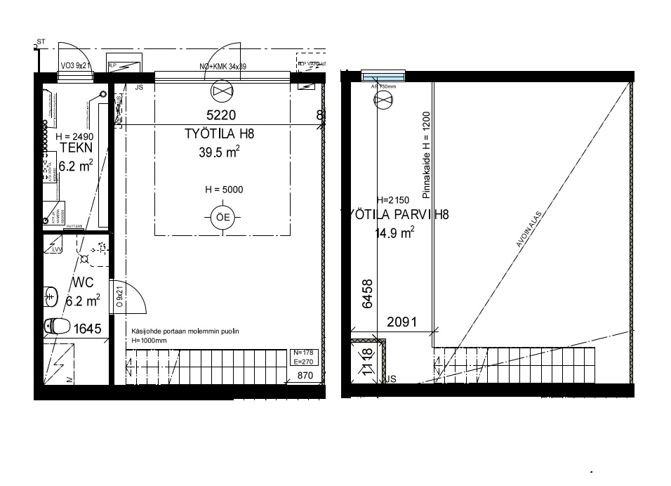 Alakerran 46 m² työtila muodostaa toimivan ja avaran kokonaisuuden, jota täydentää yläkerran 15 m² parvi. Parvi soveltuu esimerkiksi toimistoksi, työskentelytilaksi tai varastokäyttöön. Parven korkeus on 2,15 m, ja kulku on toteutettu tukevilla sisäportailla.
