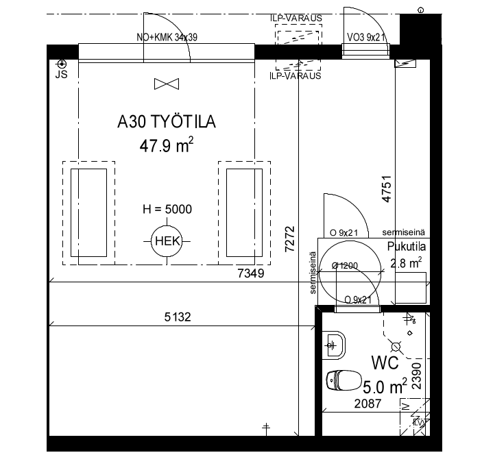 Selkeä pohjaratkaisu helpottaa kalustamista ja soveltuu monenlaiseen käyttöön. Työtilan yhteydessä on varaus ilmalämpöpumpulle ja oma WC (5,0 m²) jossa on suihkuvaraus. Ratkaisuja jotka lisäävät käyttömukavuutta erityisesti pitkäkestoisessa työskentelyssä.